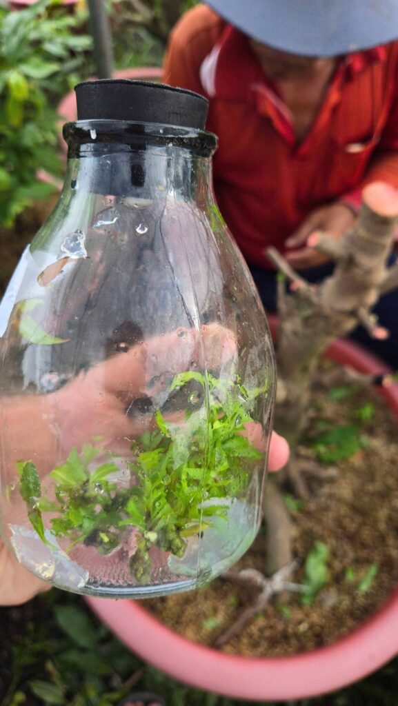 - Chọn mẫu & Khử trùng: Tách chồi đỉnh (shoot tip) từ cây mẹ Giảo Sen Bình Lợi thuần chủng, khỏe mạnh nhất. Vô trùng bề mặt để loại bỏ 100% nấm, vi khuẩn.