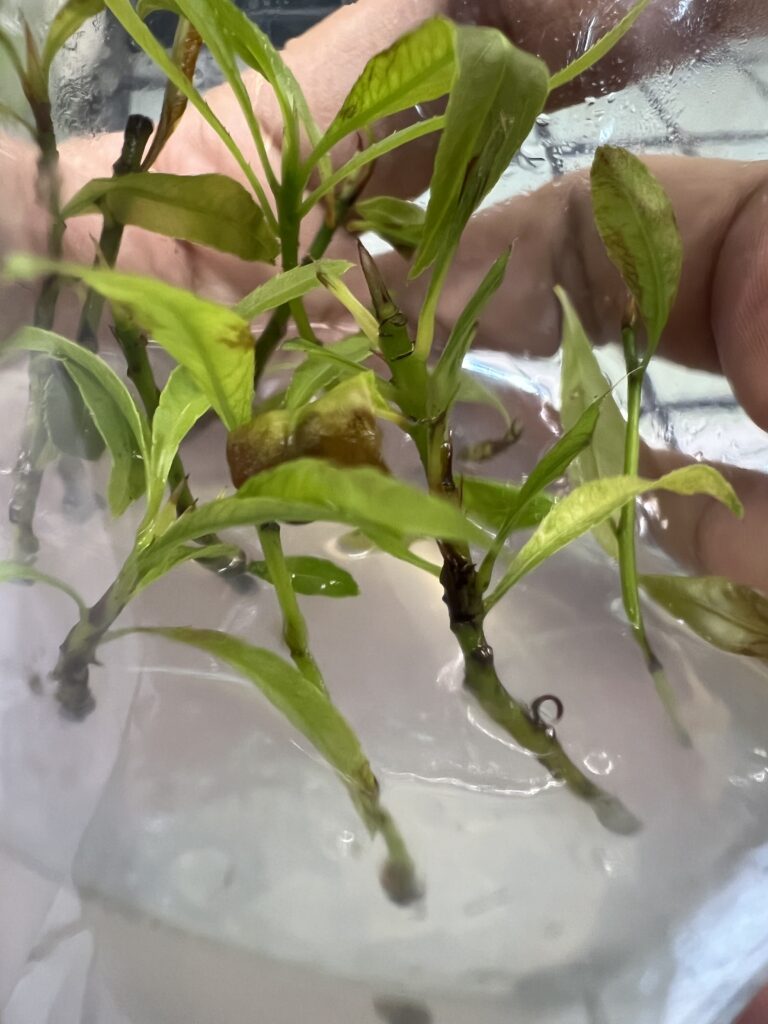 - Khử trùng bề mặt: Lá mai được rửa sạch dưới vòi nước 30 phút, rửa qua xà phòng loãng. Sau đó, đưa vào tủ cấy vô trùng, ngâm trong cồn 70 độ (30 giây – 1 phút) và dung dịch Javel 1-2% pha Tween 20 trong 10-15 phút, cuối cùng rửa lại 3-5 lần bằng nước cất vô trùng,.