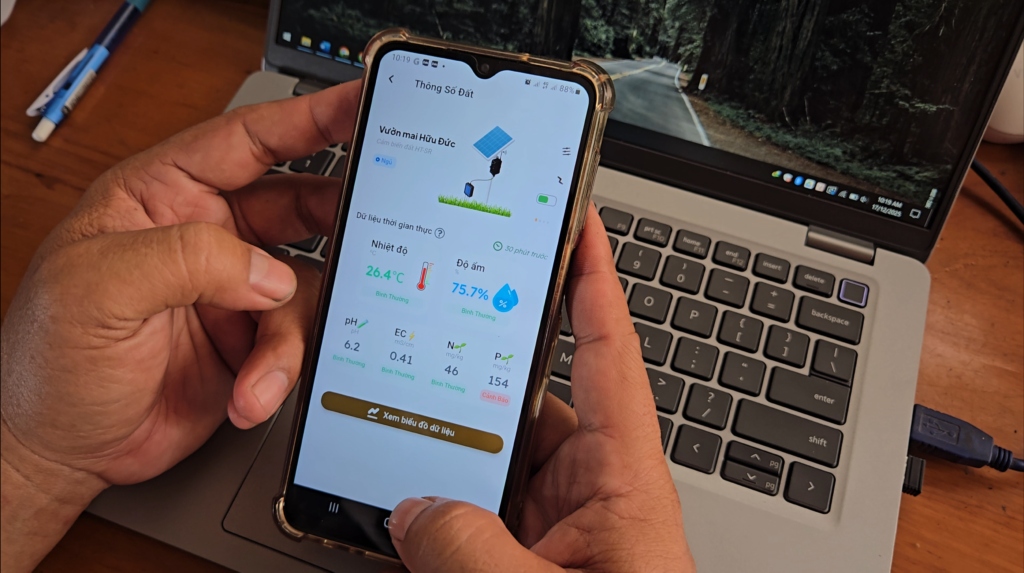 • Hệ thống cảm biến thông minh: Toàn bộ diện tích vườn tại số 852 Vườn Thơm được phủ sóng hệ thống cảm biến độ ẩm và nhiệt độ. Dữ liệu được gửi trực tiếp về điện thoại của Mr. Đức.